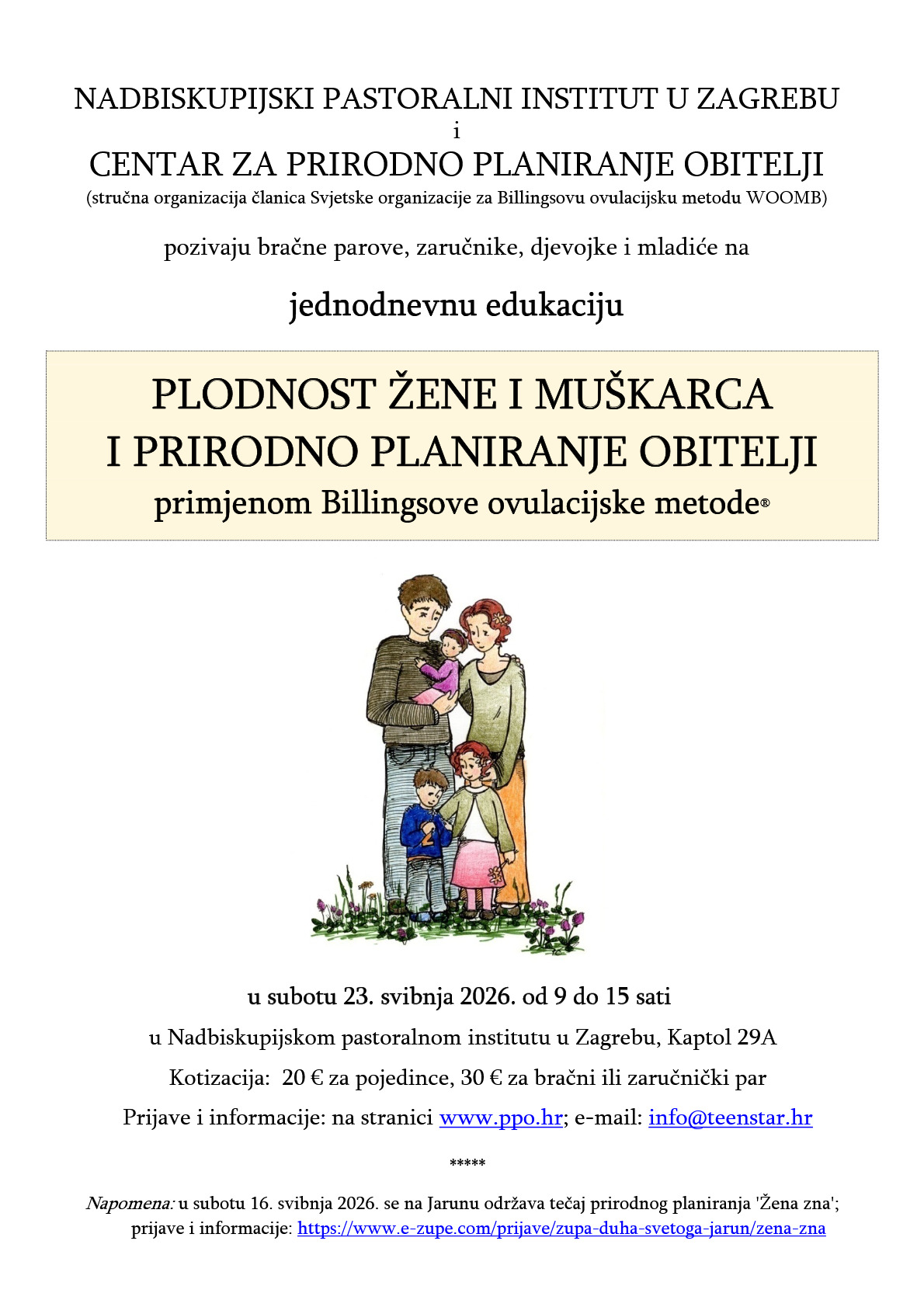 i Billingsovoj ovulacijskoj metodi® u suradnji Centra za prirodno planiranje obitelji i Nadbiskupijskog pastoralnog instituta održava se u Zagrebu dva puta godišnje od 2015. godine. Do 2023. godine ju je završilo više od 1000 mladih supružnika, zaručnika, djevojaka i mladića.